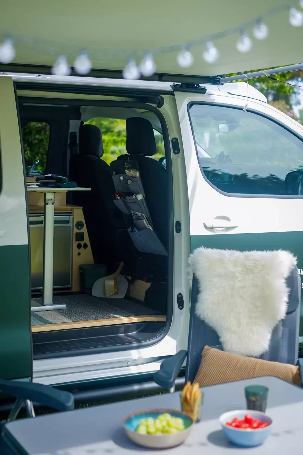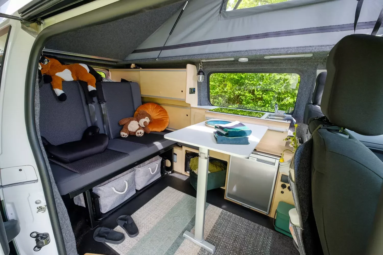 In het interieur is rekening gehouden met al je opbergbehoeften. Of het nu gaat om kleding, kampeerspullen of persoonlijke bezittingen, er is opbergruimte te vinden onder de slaapbank, tussen de voorstoelen en in de zijwanden van de camper. Aan bergruimte geen gebrek, zodat je alles netjes en georganiseerd kunt houden tijdens je reis.